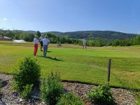 Na hřišti v Hazlově proběhl druhý letošní turnaj LSGT 2025 (místo v Kynžvartu). Na prázdninový čas byla účast 62 hráčů poměrně slušná. Počasí bylo na hony vzdálené letním slunečným dnům, ale na druhé straně bylo v podstatě beze srážek. Hřiště se též zdárně vzpamatovávalo z nedávných horkých a suchých dní, ale až na výjimky bylo ve slušném stavu. V jednotlivých kategoriích zvítězili: Muži netto HAJŽMAN Miroslav (GCALF): 43 / 43 Ženy netto JÁNSKÁ Dagmar (GCKVA): 39 / 39 Muži brutto KANDRÁČ Michal (RGCML): 25 / 83 Ženy brutto JÁNSKÁ Dagmar (GCKVA): 16 / 96 |